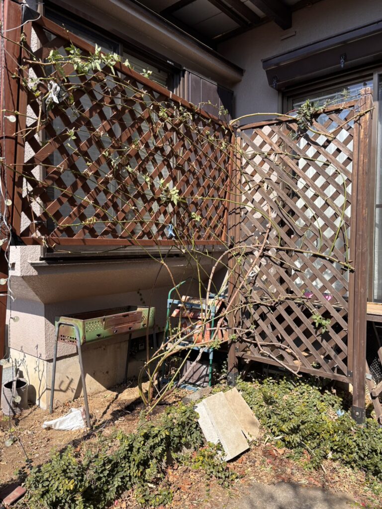 駐車場奥のフェンスには、たぶん白のモッコウバラと思われるバラがジャングル化していたので、こちらもスッキリさせました。