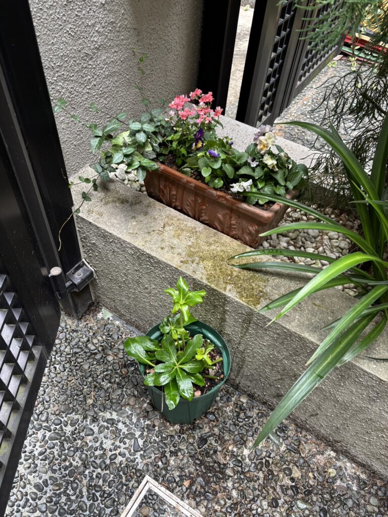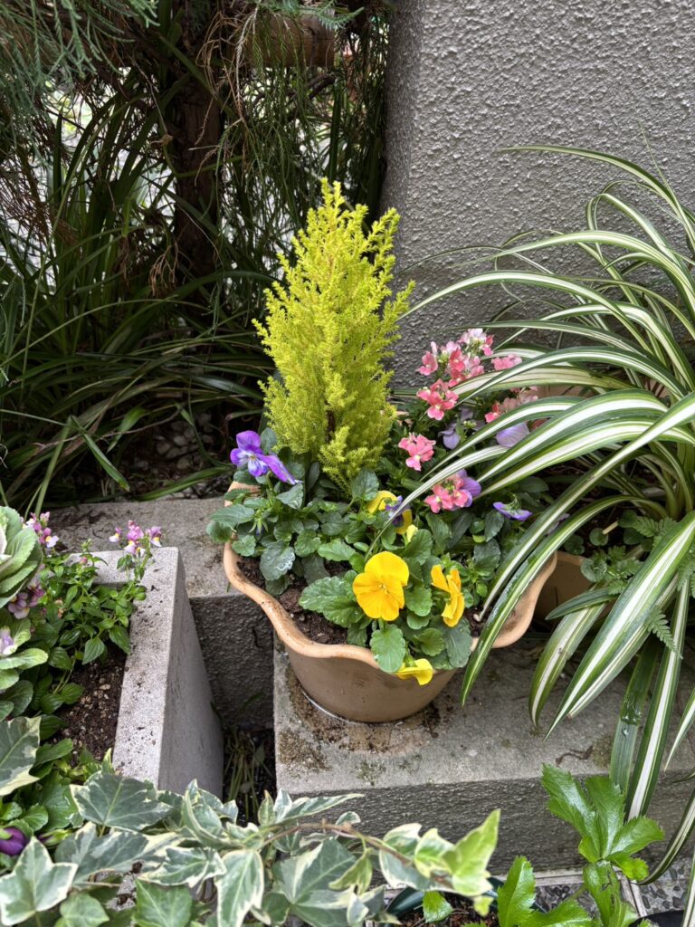 花苗は少し多めにお持ちしているので、空いている鉢におまけの寄せ植え。