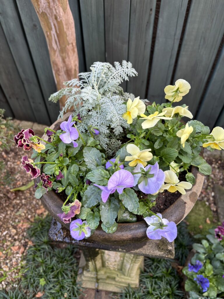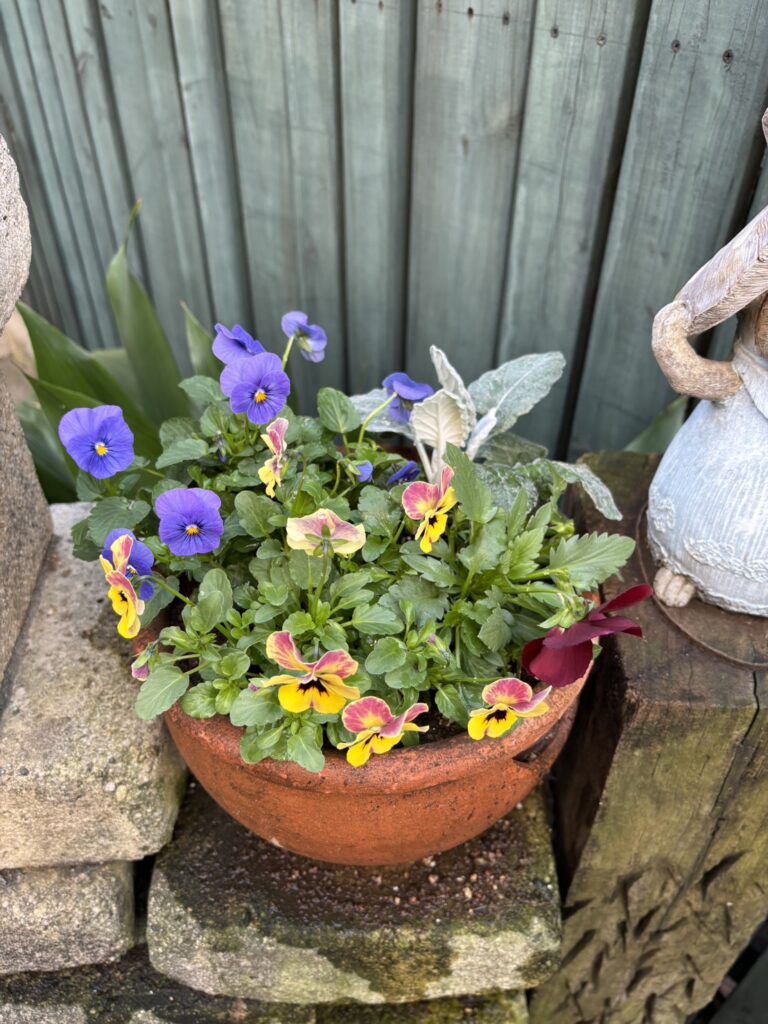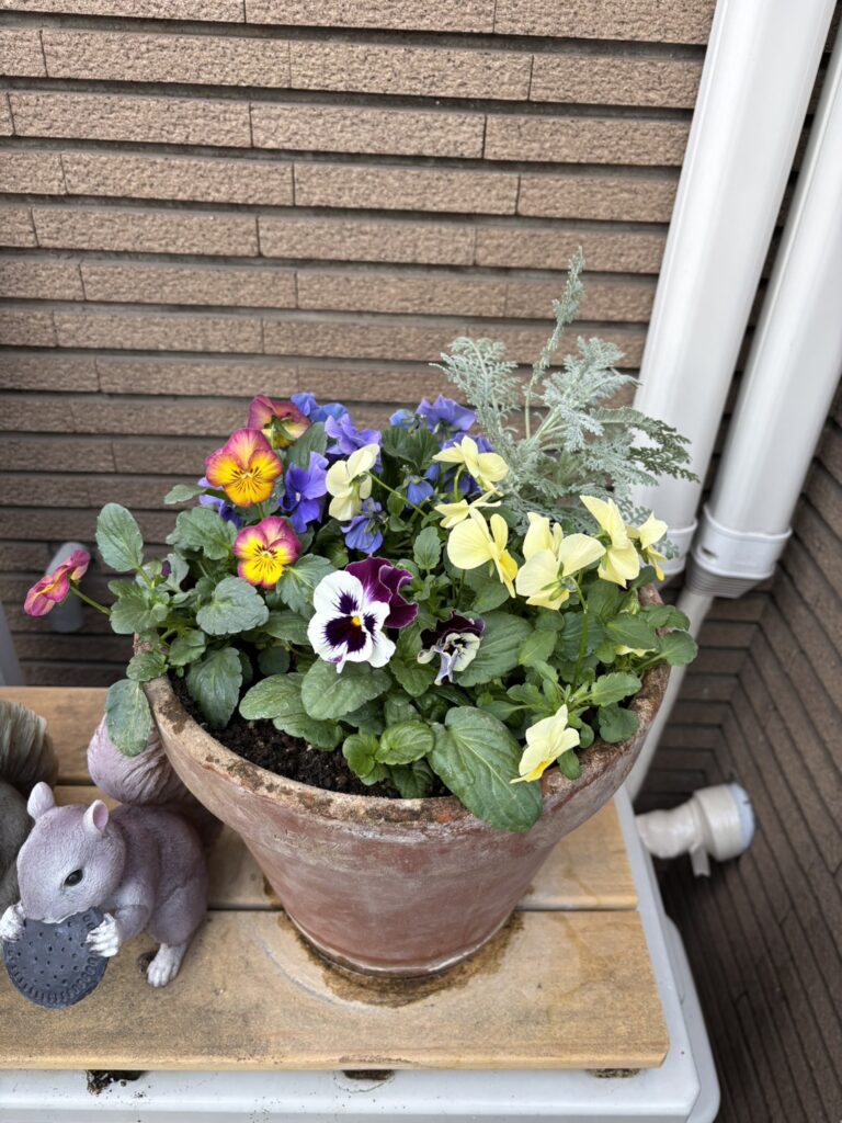 今回パンジービオラをなるべく色や形をバラバラに植え込むようにしています。