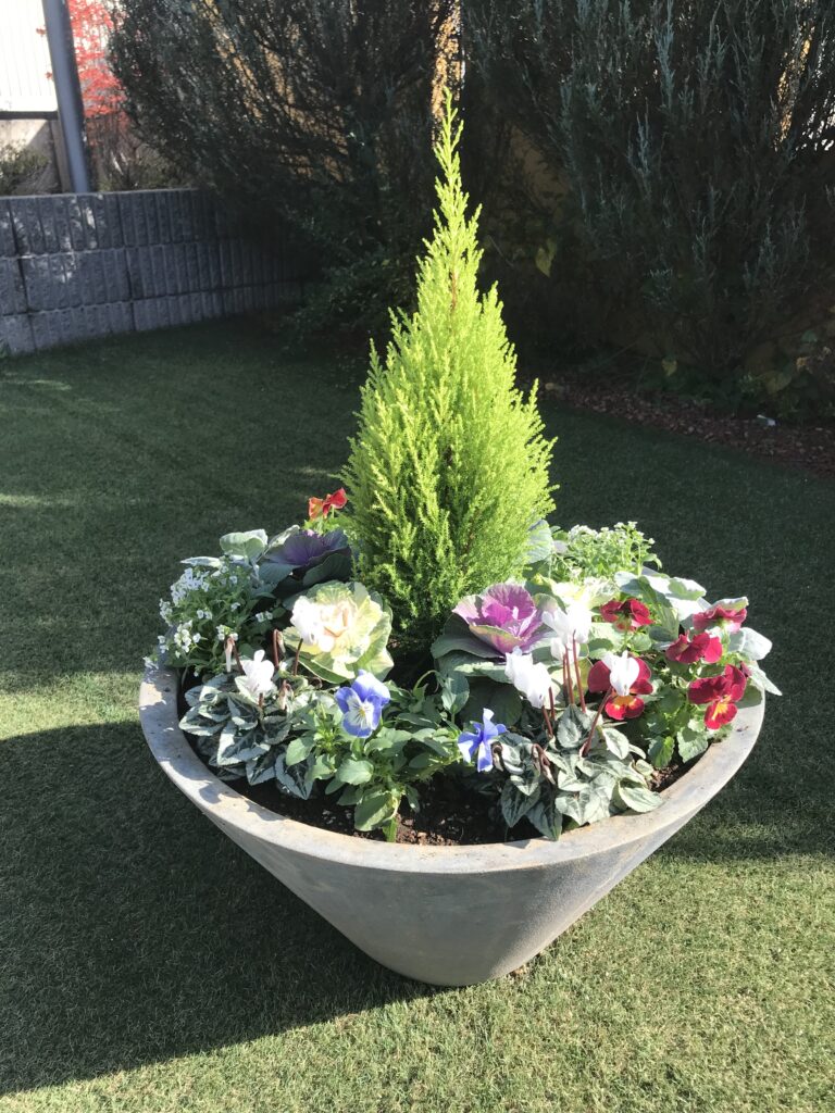 ハボタン ガーデンシクラメン ビオラパンジー アリッサム ストック シロタエギクなど、もう冬のオールスターズですよ。