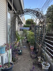 アーチの2/3位の高さまで枝は届きました。フェンス下にも3本通して、今後アーチとフェンスに誘引していければと思います。