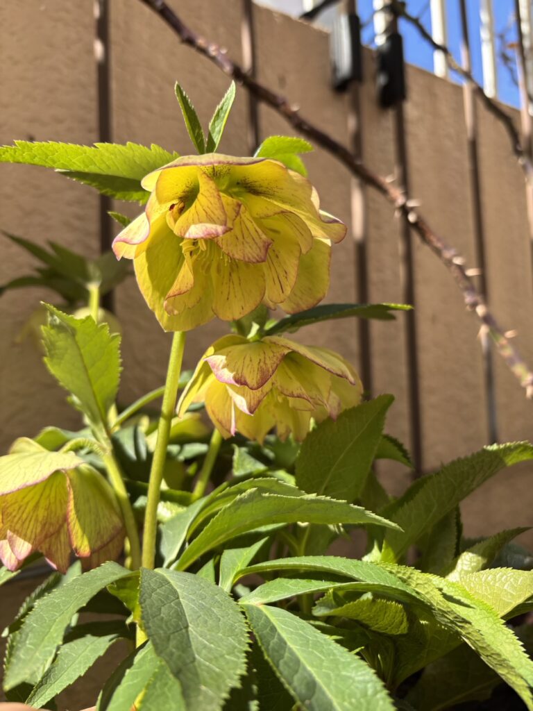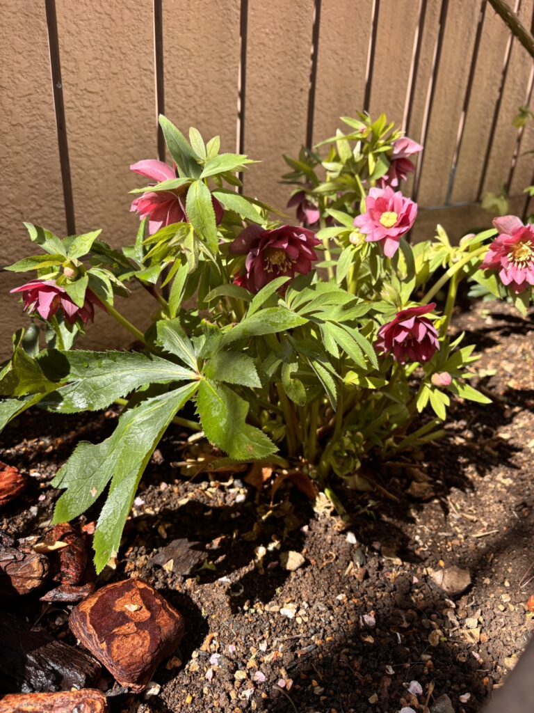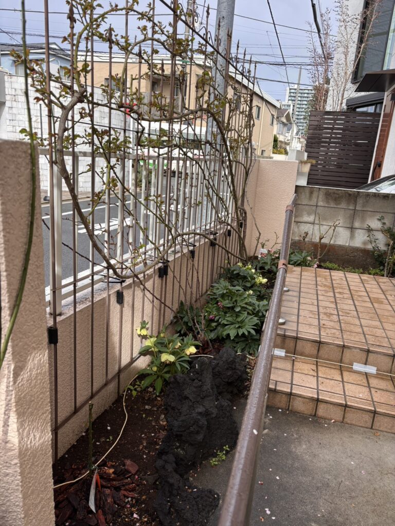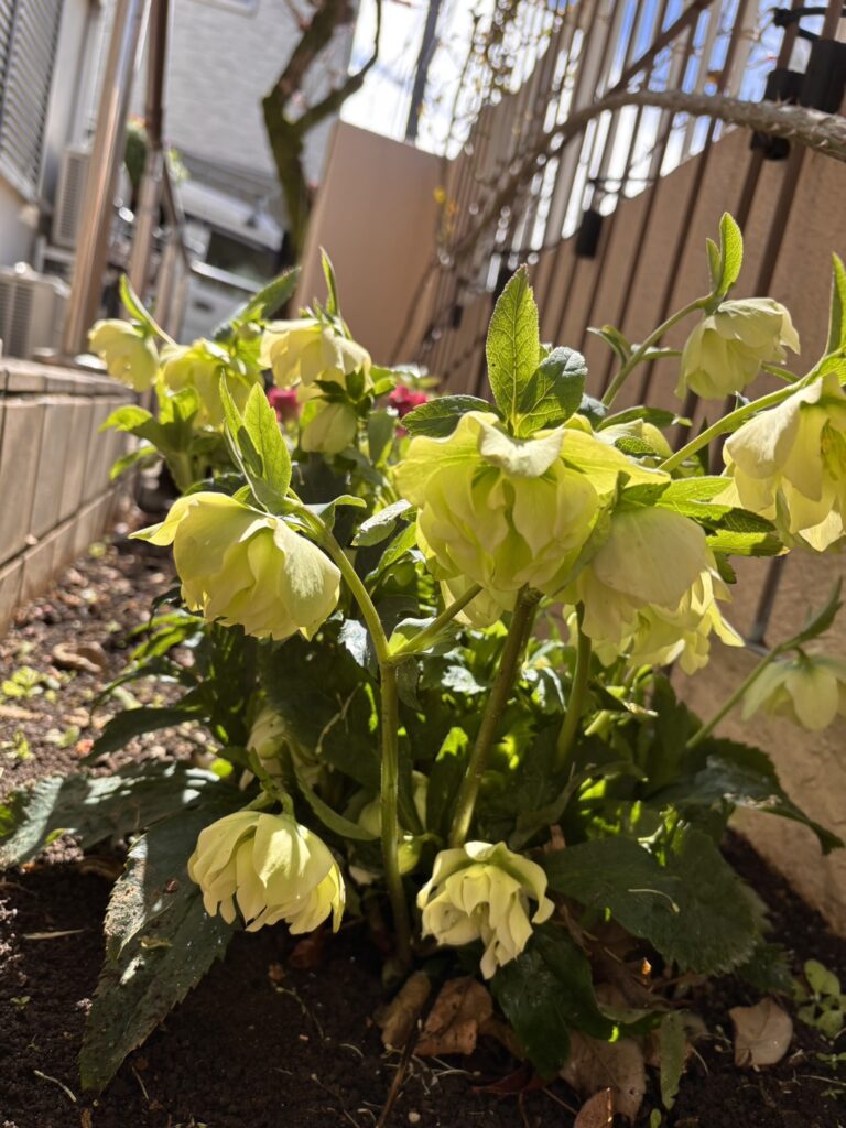 フェンスの裏、バラの株元近くのクリスマスローズが可愛く咲いていました。