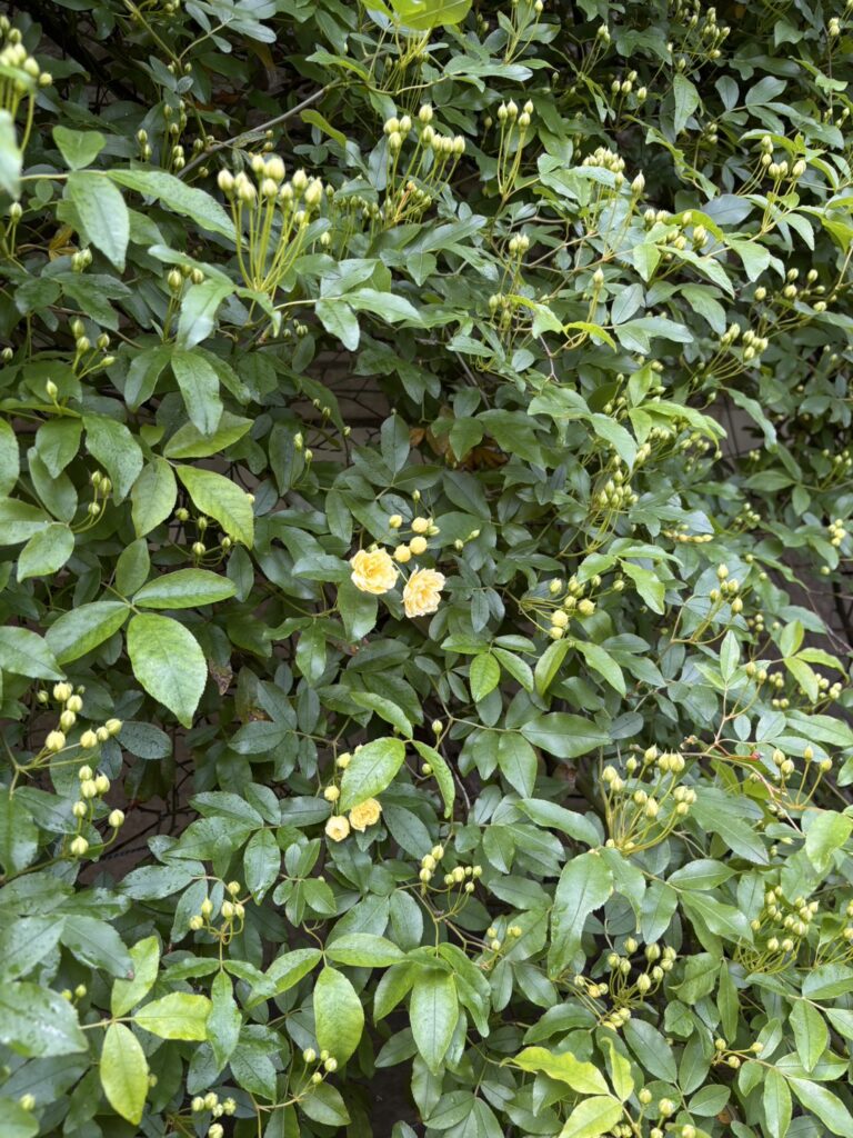 建物の壁面にはモッコウバラが一面に、まさにこれから咲き出す状態でした。