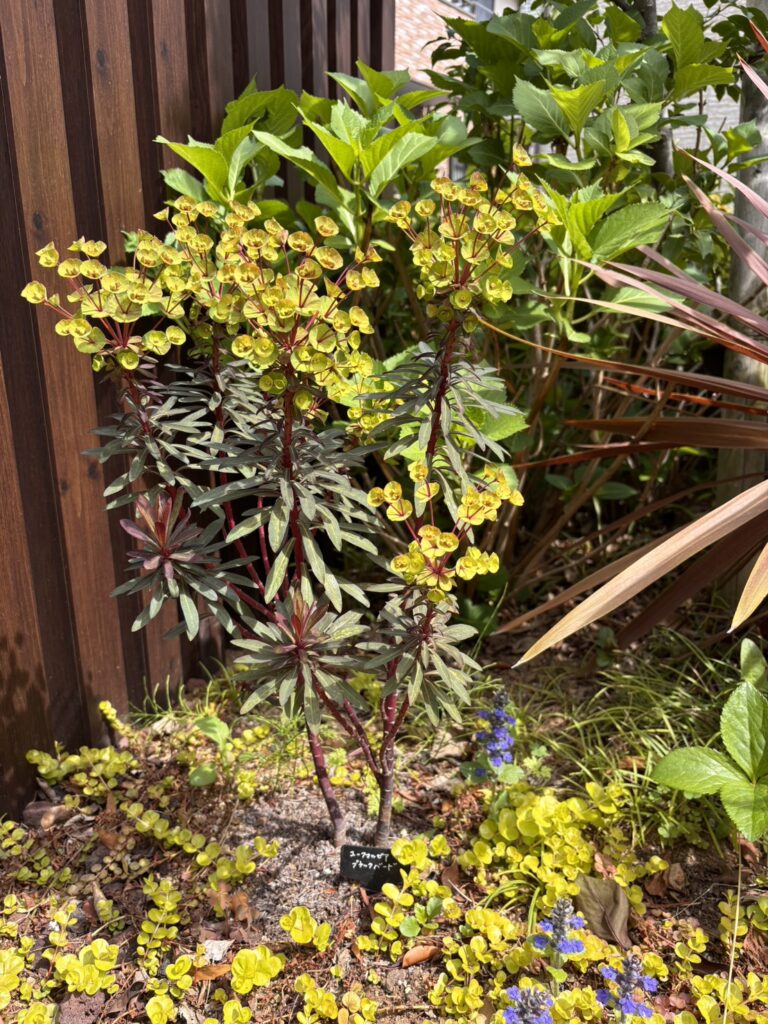 ユーフォルビア・ブラックバード、アジュガが咲き出してました。